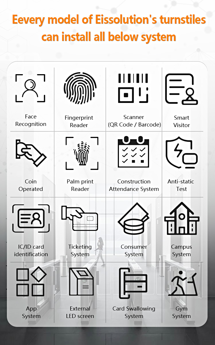 | Barrier Motor | Brushless motor/Brushed motor | Access Control Type | RFID Card. QR Code. Fingerprint. Face Recognition. ESD System |