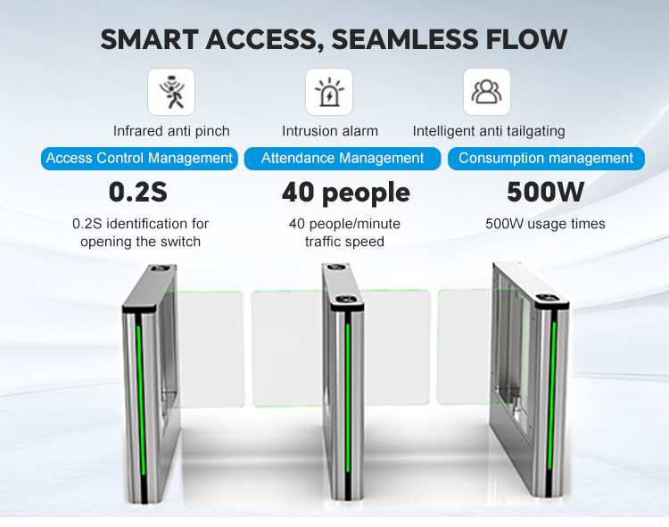 | Pass Speed | 30-45 persons/minute | Door Wing Material | 10mm Transparent Acrylic/Tempered Glass |