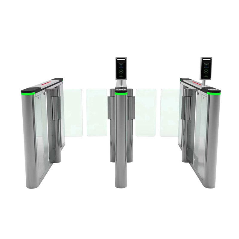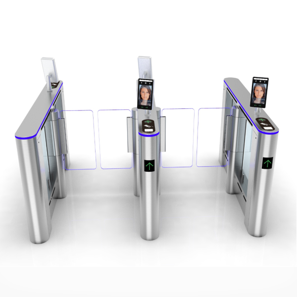 Premium optical speedlane turnstile with servo motor barrier. Features RFID access control for high-speed, seamless pedestrian traffic in Indonesia‘s corporate lobbies and premium offices.