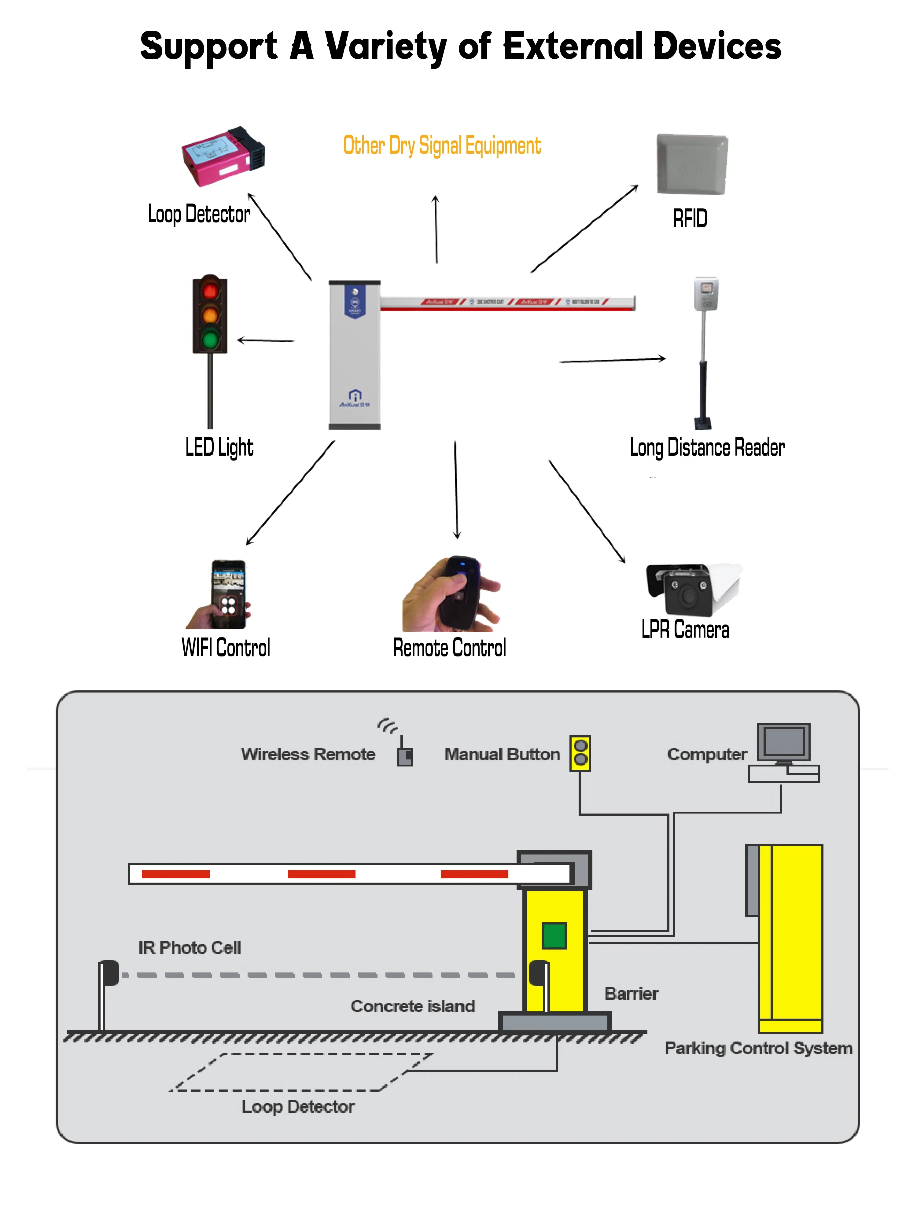| Tipe Lengan Barrier | Straight, Fencing, Folding, Telescopic | Tegangan Gate | AC220V 10% 50Hz |