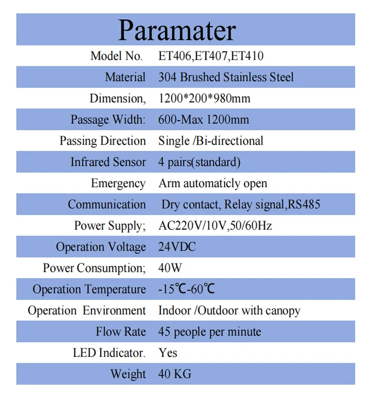 | Working Environment | Outdoor (Canopy) and Indoor | Flow Rate | 35-60 Passages/minute |